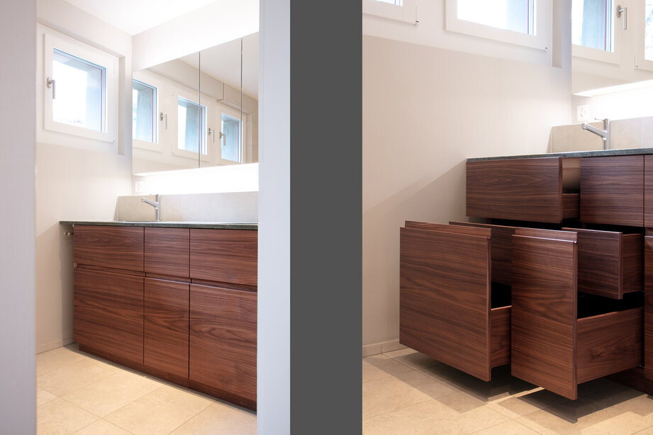 Alle Nasszellen und die Küche wurden komplett erneuert. Die Küche wurde zum Wohnzimmer hin geöffnet und eine alte Verbindungstüre geschlossen. Durch diese Massnahmen wirkt die Küche grosszügiger, offener und wurde in Verbindung mit Ess- und Wohnzimmer zu einem eigentlichen Lebensraum.