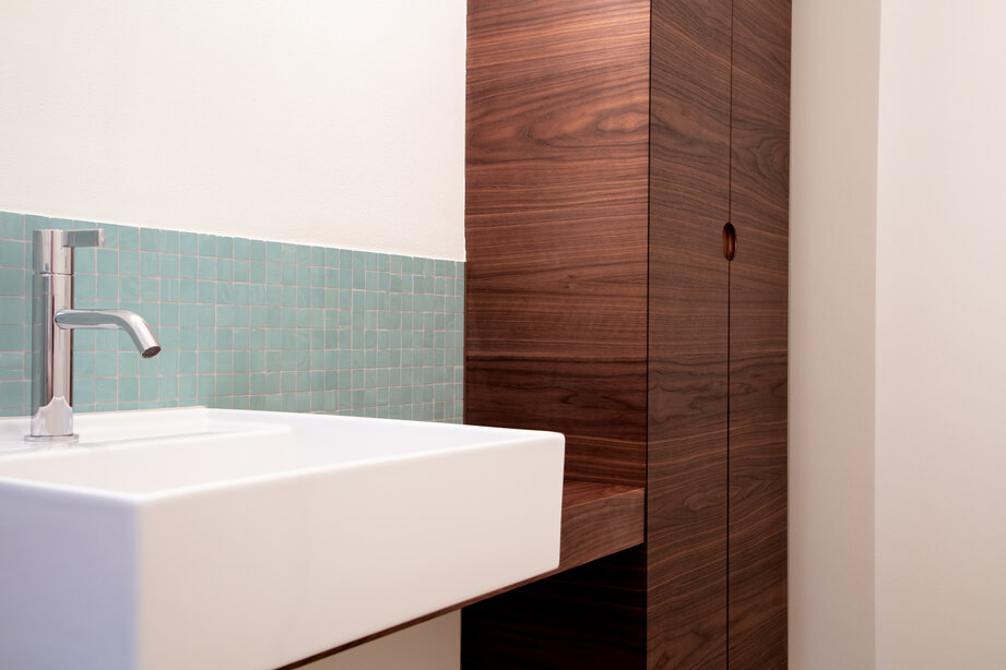 Vorbild für die Materialisierung und Farbgebung war der Bestand des EFH’s aus den 50er Jahren. Durch die Neuinterpretation dieses Stiles ergab sich ein sehr stimmiges Ambiente. So wurden die grünlichen Granite aus dem Hinterrhein (Andeer, Spluga Verde und Hinterrheinquarzit) mit Nussbaumfurnier, grünen Mintfarbtönen und Glas-Mosaikplatten im Zusammenspiel mit den bestehenden Bodenbelägen verbunden.
