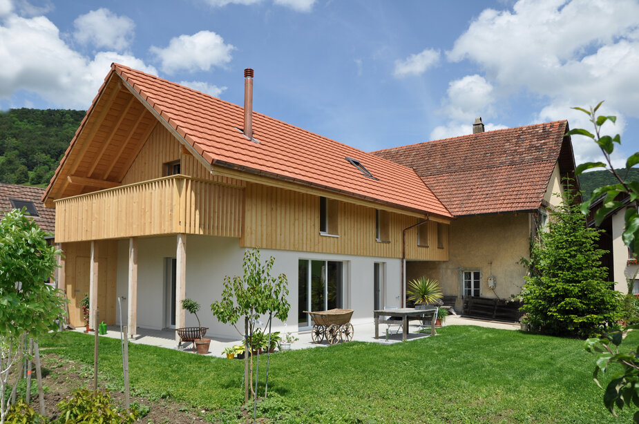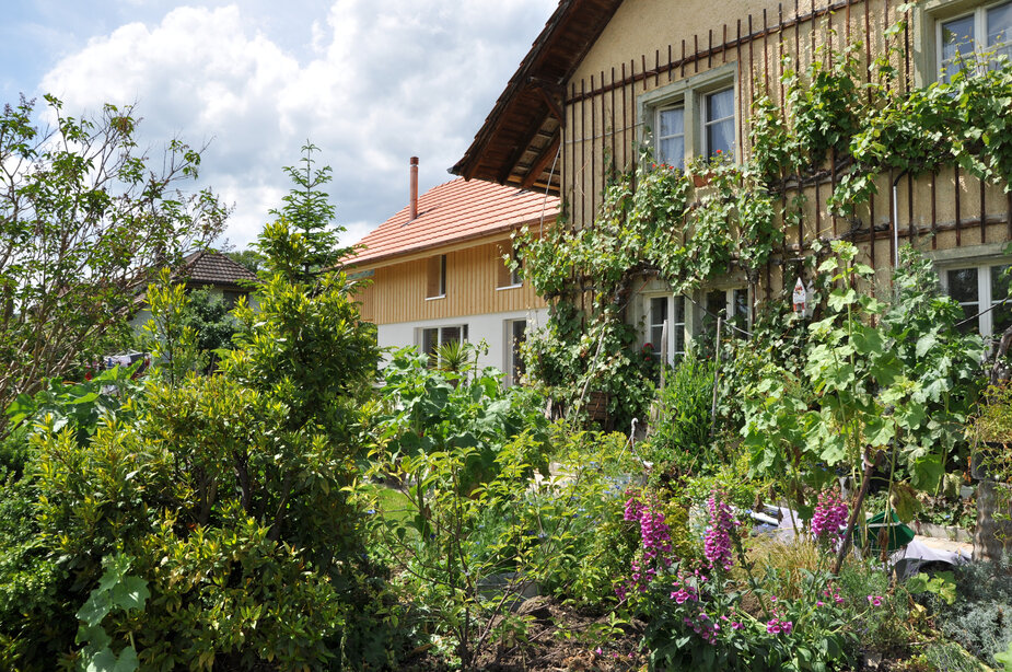 Die Bauherrschaft wollte zu Beginn der Planung einen bestehenden Anbau, der als Schopf diente, als eigenständigen Hausteil ausbauen und sanieren. Nach eingehender Planung kam die Einsicht, dass ein Ersatzbau sinnvoller sei. In gleicher Grösse und Volumen wurde ein zeitgemässer Neubau mit Wohn- und Schlafräumen erstellt, der sich wie selbstverständlich in die bestehende Situation mit Haus und Garten einfügt.