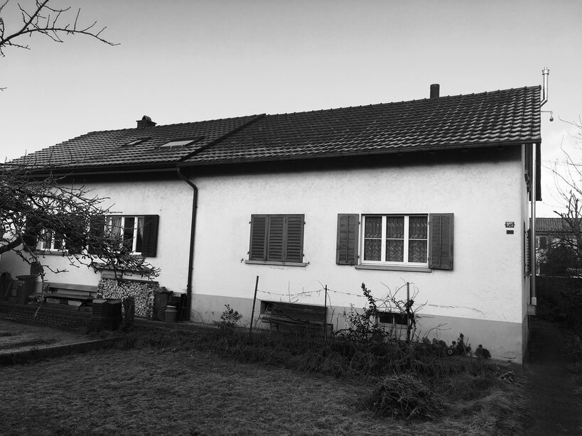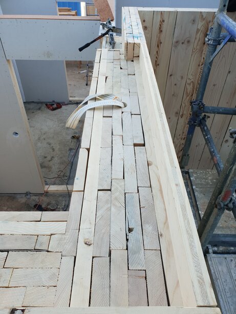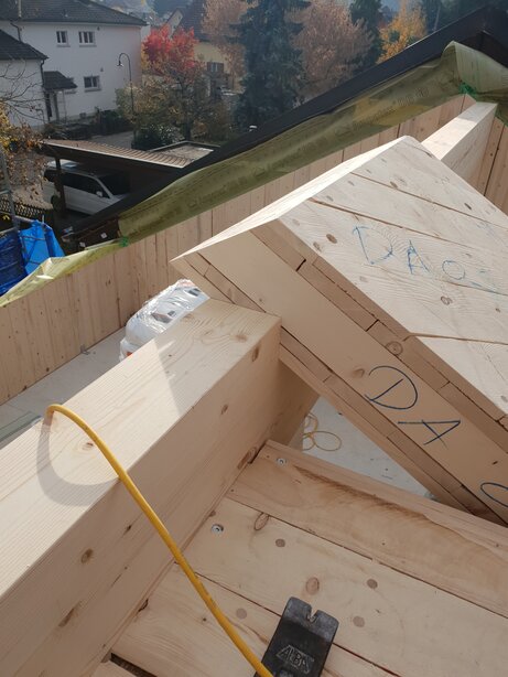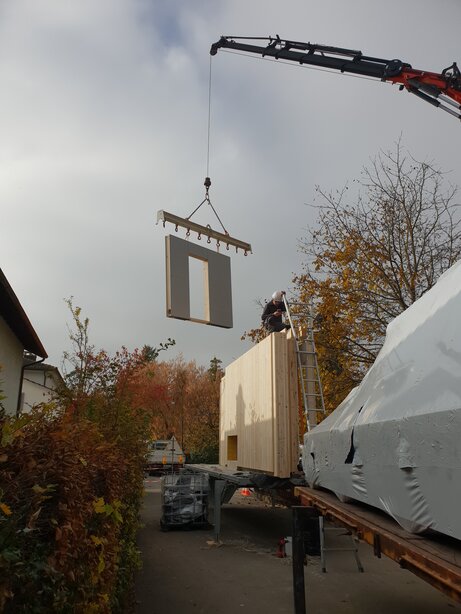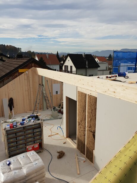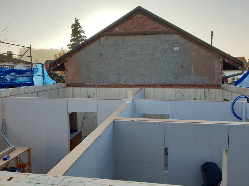 Die DEFH-Hälfte wurde bis auf die betonierte Deckenplatte über UG und die Brandwand rückgebaut und neu in einer Massivholz-Bauweise neu aufgebaut.