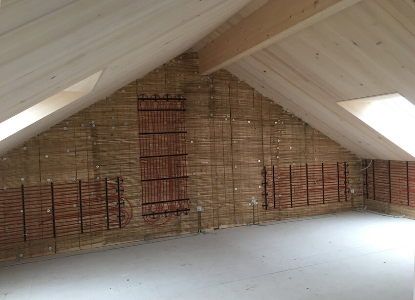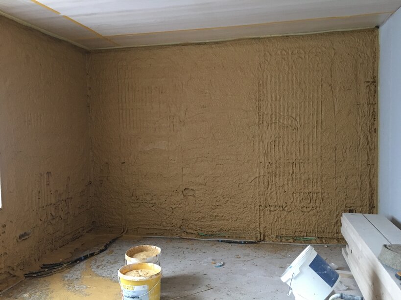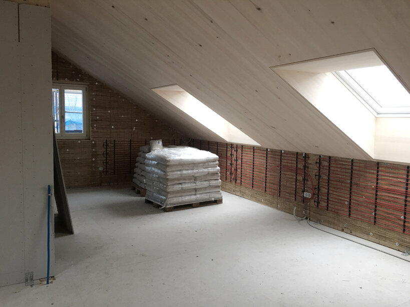 Innen wurden die Vollholzelemente mit einer Schilfmatte ausgekleidet auf welche die Wandstrahlheizung montiert ist. Die Oberfläche wurde danach mit einem 4cm starken Lehmputz versehen. Die Geschossdecken mit Brettstapeln aus sägerohen Fichten Lamellen sind sichtbar. Beschwert wurde die Decke wird mit einer Kalksandsteinschüttung. Gehbelag ist ein Massivholzparkett.