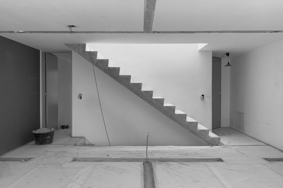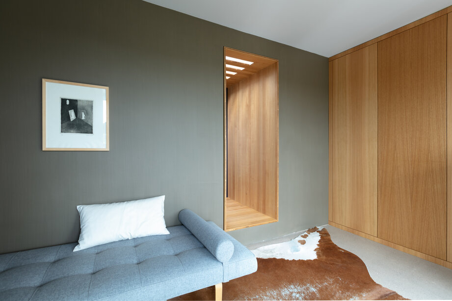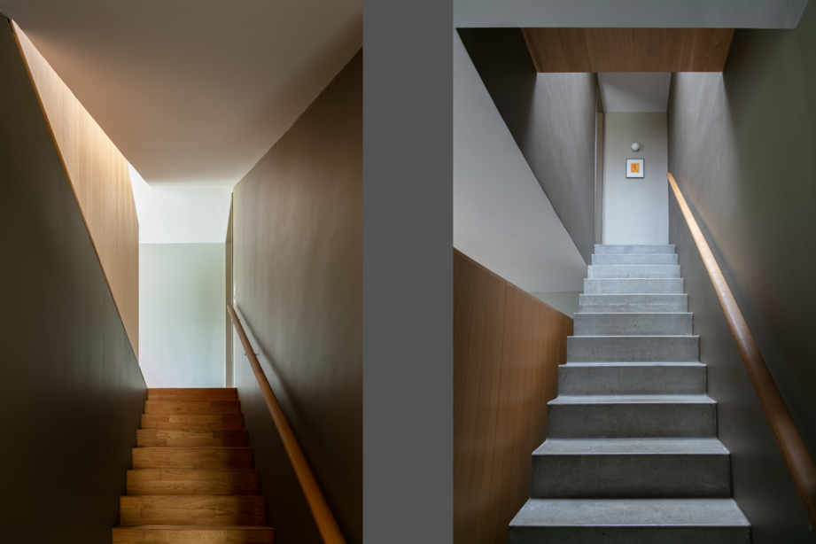 Im Attikageschoss wurden 2 Türen zugemauert. Als Ersatz dient eine kleine Brücke als Zugang zum Schlafzimmer, die quer über dem Treppenlauf und unter dem bestehenden Oblicht platziert ist.