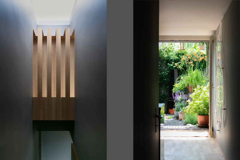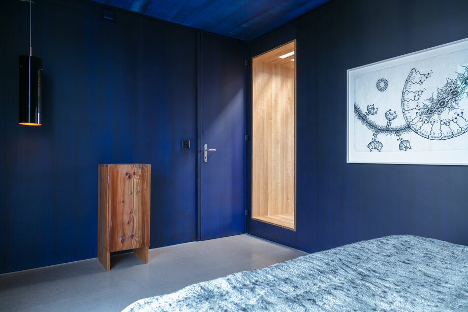 Der bestehende Eichenparkett im Erdgeschoss wurde geschliffen und geoelt. Alle neuen Einbauten sind aus Eiche, natur geoelt. Alle Wände und Decken im Haus sind mit vier unterschiedlichen «KT- Color- Farben» gestrichen.