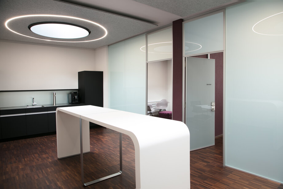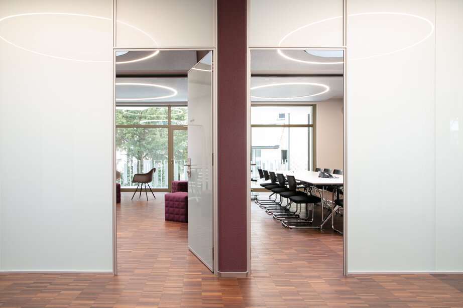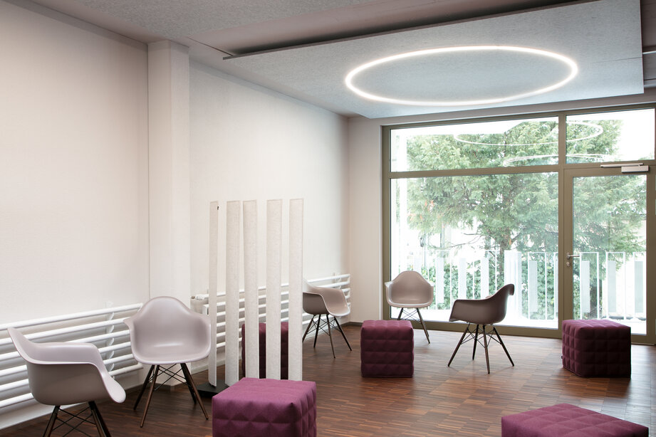 Blickfang bildet der neue Vortragssaal der Hirslanden Klinik Aarau mit einer Stahlkonstruktion, Akazienparkett und Akustikdecken mit integrierter Beleuchtung. Zwei Sitzungszimmer mit vorgelagerter Cafeteria ergänzen das Raumangebot.