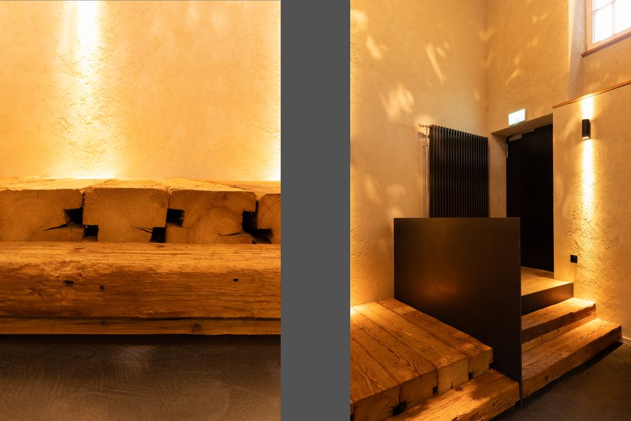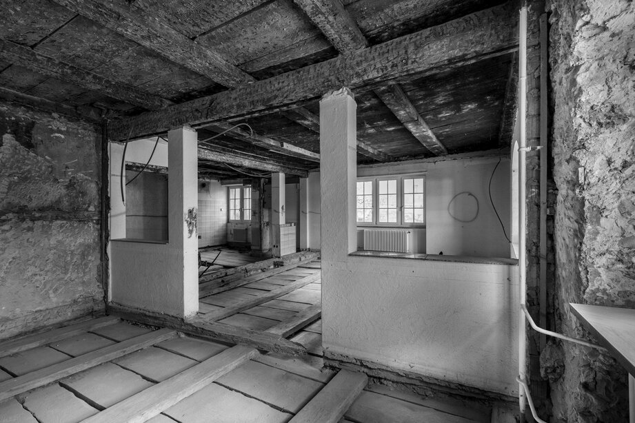Aufgrund statischer und bautechnischer Erfordernisse wurden einige Deckenbereiche komplett ersetzt, wobei die historische Balkenlage geschickt genutzt wurde, um das neue Podest im Erdgeschoss zu gestalten. Diese Massnahme ermöglichte es, den ursprünglichen Charakter des Gebäudes beizubehalten und gleichzeitig den Anforderungen an eine moderne Nutzung gerecht zu werden.