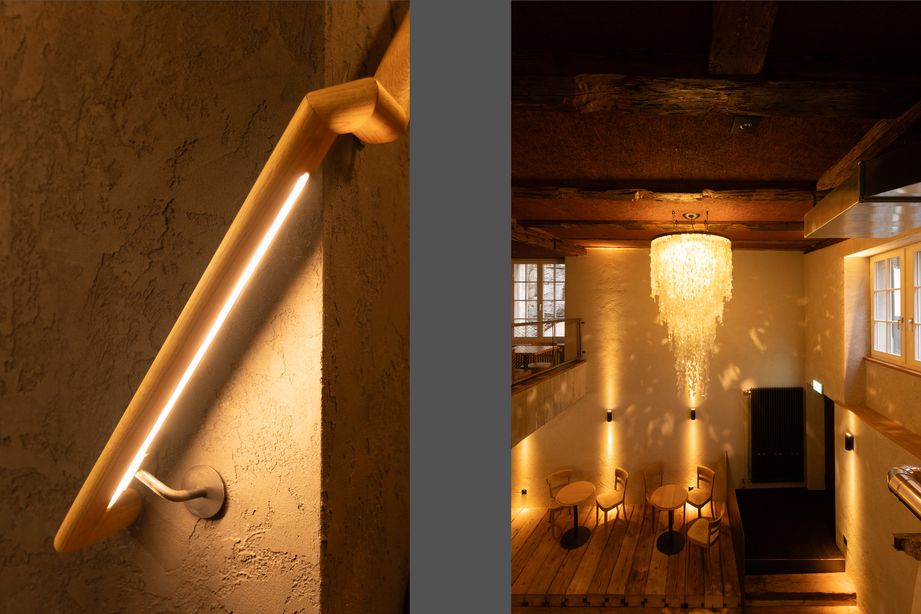 Ein zentrales Element des Umbaus war die Neuplatzierung der Küche im Erdgeschoss, die nun zusammen mit einer Bar- und Buffet-Anlage optimal angeordnet ist. Diese Neugestaltung ermöglicht es, in den Sommermonaten Gäste auf dem Aussenplatz unter dem Kastanienbaum zu bedienen und so ein attraktives Ambiente zu schaffen. Das Innenrestaurant verbleibt in der bestehenden Fläche im Obergeschoss, wobei die früheren niedrigen Raumhöhen durch einen zweigeschossigen Luftraum geöffnet wurden, was den Räumen mehr Luftigkeit und Helligkeit verleiht.