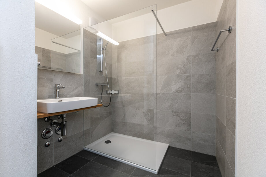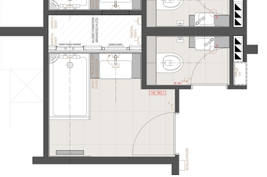 Die Badezimmer mit den entsprechenden Installationen stammen noch aus dem Erstellungsjahr 1962. Sämtliche Schmutzwasserleitungen und Lüftungsschächte waren asbesthaltig und wurden unter Einhaltung der gültigen Schutzmassnahmen vorschriftsmässig rückgebaut.