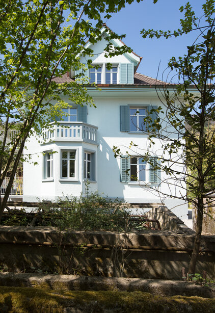 Der Umgang mit der bestehenden Bausubstanz des Altbaus und einem baubiologischen Materialkonzept ist für uns eine selbstverständliche Herausforderung. In enger Zusammenarbeit mit der Bauherrschaft wurde ein stimmiges Farbkonzept im Kontext mit dem bestehenden EFH und der Gartenanlage realisiert.