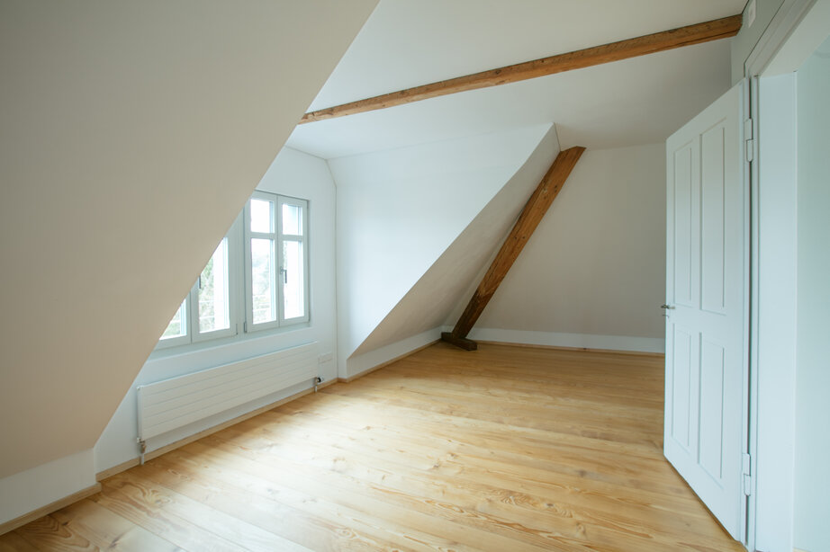 Die obere Wohnung wurde durch den Ausbau des Dachgeschosses stark vergrössert. Um den Wohnwert im Dachgeschoss nachhaltig zu verbessern, wurden die Dachflächen mit schweren Holzdämmstoffen gedämmt.