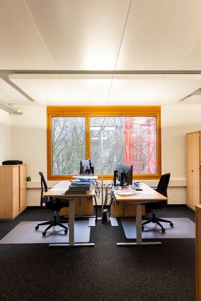 In den oberen Geschossen (1. und 2. OG) wurden die Grundrisse neu gegliedert, um Einzelbüros und Grossraumbüros zu kombinieren. Alle Arbeitsräume sind mit Kühl- und Heizdecken ausgestattet und ermöglichen so einen energieeffizienten Betrieb mit hohem Komfort. Ergänzt wird das Raumprogramm durch mehrere Sitzungszimmer und einen gross dimensionierten Serverraum. Ebenfalls wurden die Nasszellen ergänzt und erneuert.