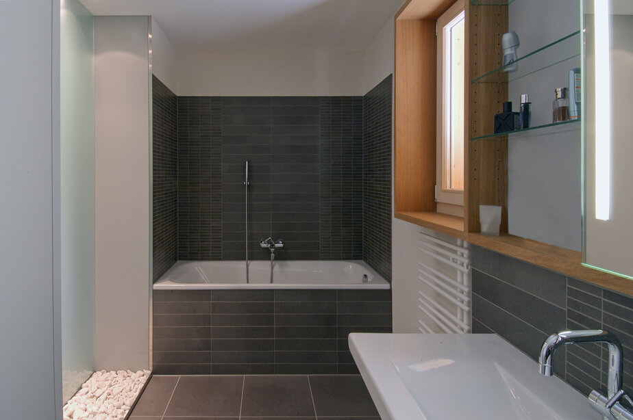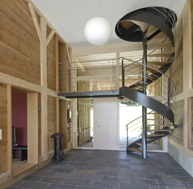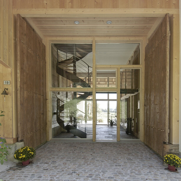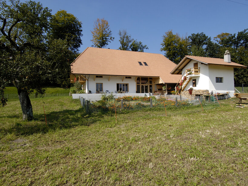 Das bestehende Bauernhaus liegt in einer sehr ländlichen Umgebung am Rande des Dorfes. Die Scheune und der Stall waren in originalem Zustand, das Wohnhaus wurde mehrmals um- und angebaut und war in einem baufälligen Zustand. Der Wohnteil wurde abgerissen und ein Neubau ermöglichte eine zeitgemässe Grundriss- Struktur und eine Klärung des Ziegeldaches in seiner ursprünglichen Form. Der Scheunenteil wurde saniert und grossflächig verglast. Er dient als Eingangszone und verbindet das Ober- und Dachgeschoss mit einer Wendeltreppe.