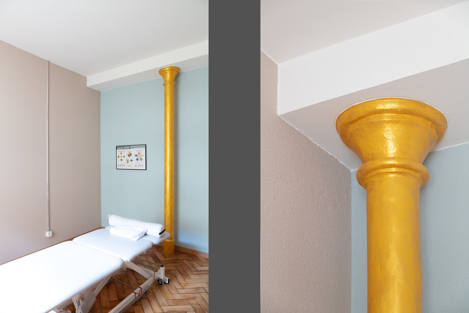 Einen besonderen Akzent setzten die alten Guss- Säulen. Diese wurden mit einem Anstrich in «Gold»- Farbe als statisches Element akzentuiert.