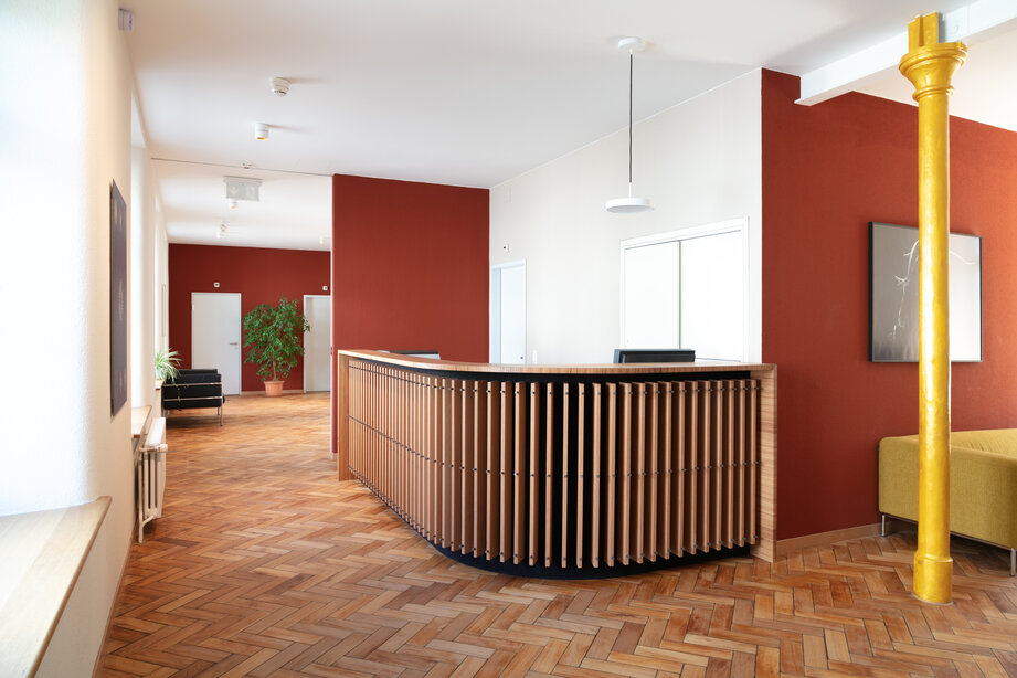 Der originale Fischgrat- Buchenparkett wurde geschliffen und frisch geölt. Er erinnert mit seinen Kratzern und Spuren an seine Geschichte als ehemaliger Industrieboden.