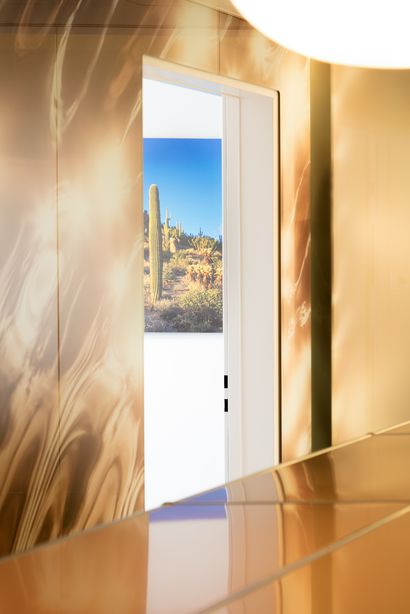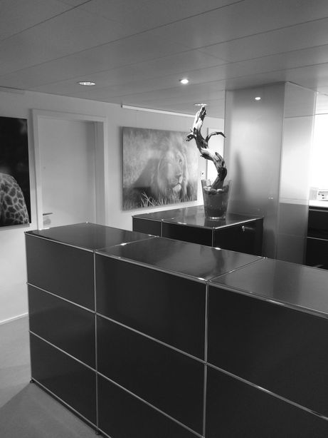 Die hellen, natürlichen Farbtöne der Wandflächen und der USM-Möbel stehen in Kontrast mit der ausgewählten Beleuchtung. Als Blickfang wirkt der Fotoprint auf raumhohen Glaselementen, die sich vom Eingangsbereich bis ins Wartezimmer erstrecken. Als Druckvorlage diente ein unverändertes Ferien-Foto des Bauherrn vom Wasser auf der Insel Korfu.
